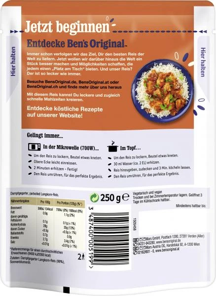 Schonend vorgegarter Original-Langkorn-Reis im 250g-Beutel für 1 bis 2 Personen.