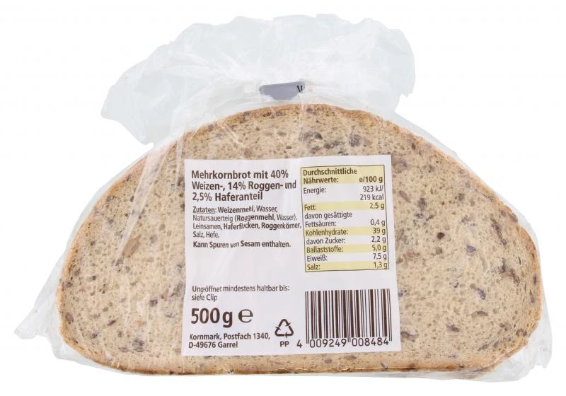 Mehrkornbrot mit 40% Weizen-, 14% Roggen und 2,5% Haferanteil.