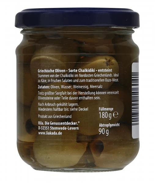 Griechische Oliven – Sorte Chalkidiki – entsteint stammen von der Chalkidiki im Nordosten Griechenlands. Ideal zu Käse, in frischen Salaten und zum traditionellen Ouzo-Mezé.