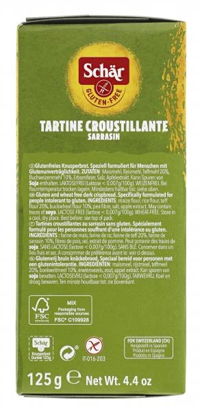 Eine echte Ballaststoffquelle! Das vegane Schär Knusperbrot Dunkel wird mit einem Teig aus Buchweizen- und Teffmehl gebacken. Daraus entsteht die luftige und gleichzeitig krosse Struktur des Brotes. Der knusprige Energielieferant lässt sich süß oder herzhaft genießen – 100% frei von Gluten und Laktose.