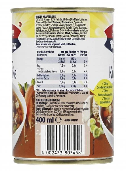 Artikelnummer: Y29TY 4502050439 Kategorien: Dosengerichte, Fertiggerichte & Konserven, Suppen, Weitere Suppen Schlagwort: Sonnen Bassermann